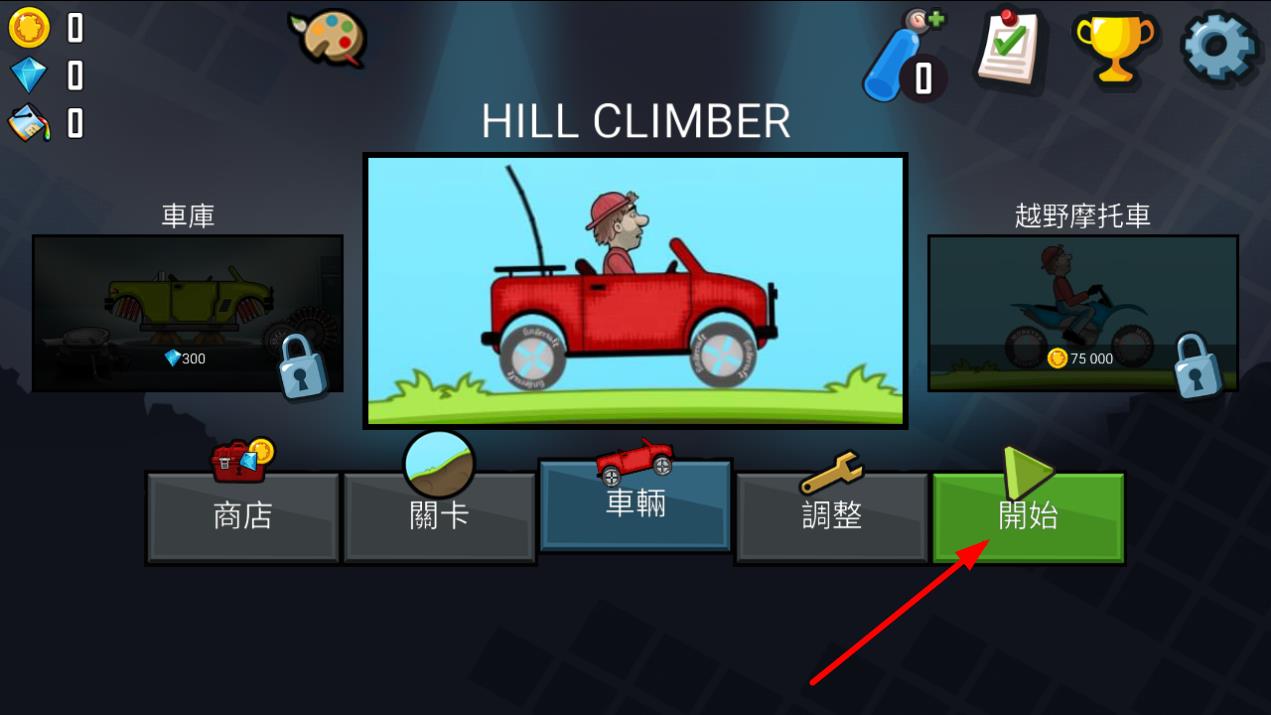 2、選擇自己心儀的載具,或者花費(fèi)鉆石、金幣解鎖如越野摩托車(chē)等更多車(chē)輛,選好車(chē)后,點(diǎn)擊開(kāi)始按鈕進(jìn)入關(guān)卡挑戰(zhàn)。