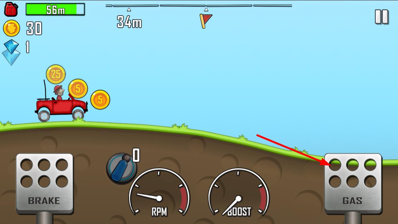 3、在游戲過(guò)程中,通過(guò)點(diǎn)擊屏幕下方右側(cè)的GAS按鈕來(lái)控制油門(mén)前進(jìn),左側(cè)的BRAKE按鈕控制剎車(chē),行駛時(shí)注意收集金幣,同時(shí)要根據(jù)路況合理把控車(chē)速和力度。