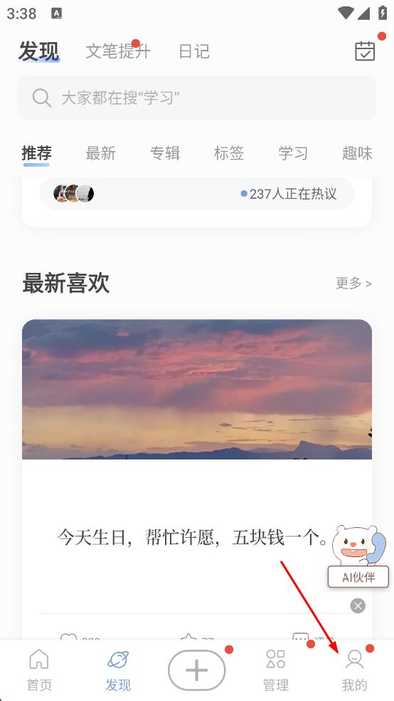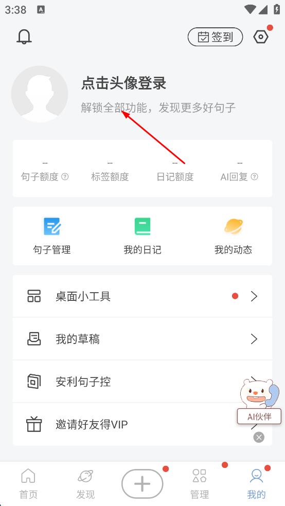 1、打開句子控APP,進入發(fā)現(xiàn)頁面后,能看到各類推薦內(nèi)容,點擊頁面右下角“我的”選項,進入個人中心頁面。