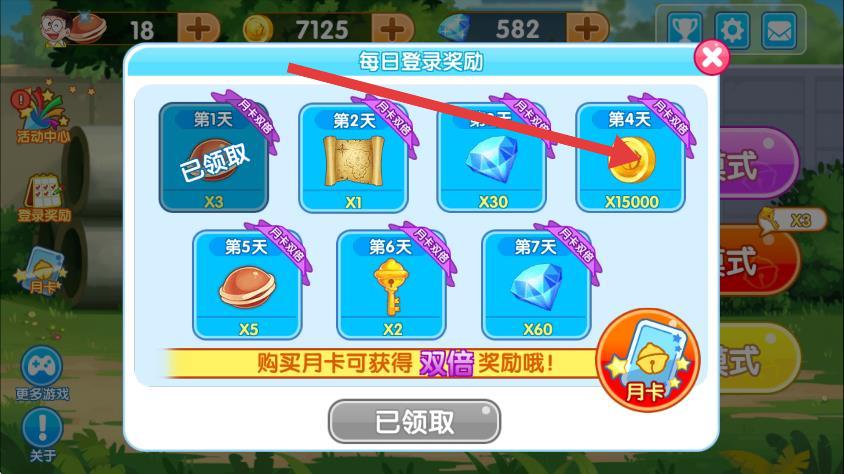 4、點(diǎn)擊主界面左側(cè)的登錄獎勵,在對應(yīng)的登錄天數(shù)可領(lǐng)取金幣獎勵。