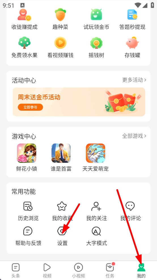 1、打開趣頭條APP,進(jìn)入底部導(dǎo)航欄我的,點(diǎn)擊設(shè)置。