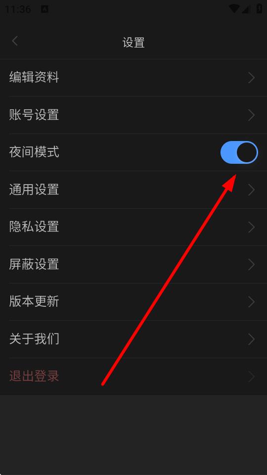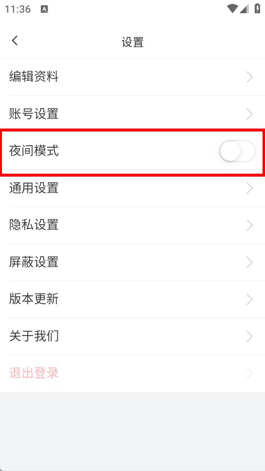 3、在設(shè)置界面里找到夜間模式選項(xiàng),點(diǎn)擊其右側(cè)的開關(guān)按鈕。