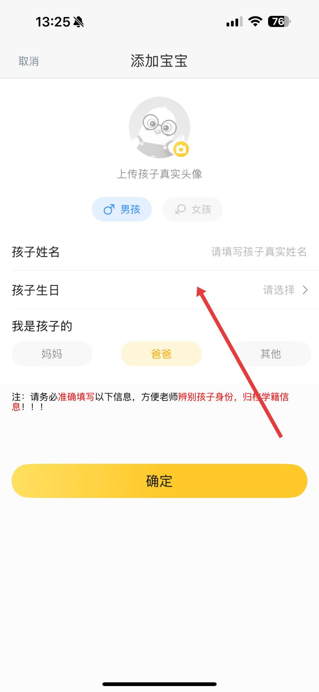 3、進(jìn)入添加寶寶頁面后,上傳孩子真實頭像,選擇孩子性別,填寫孩子姓名、生日,并選擇自己與孩子的關(guān)系,最后點擊確定按鈕。