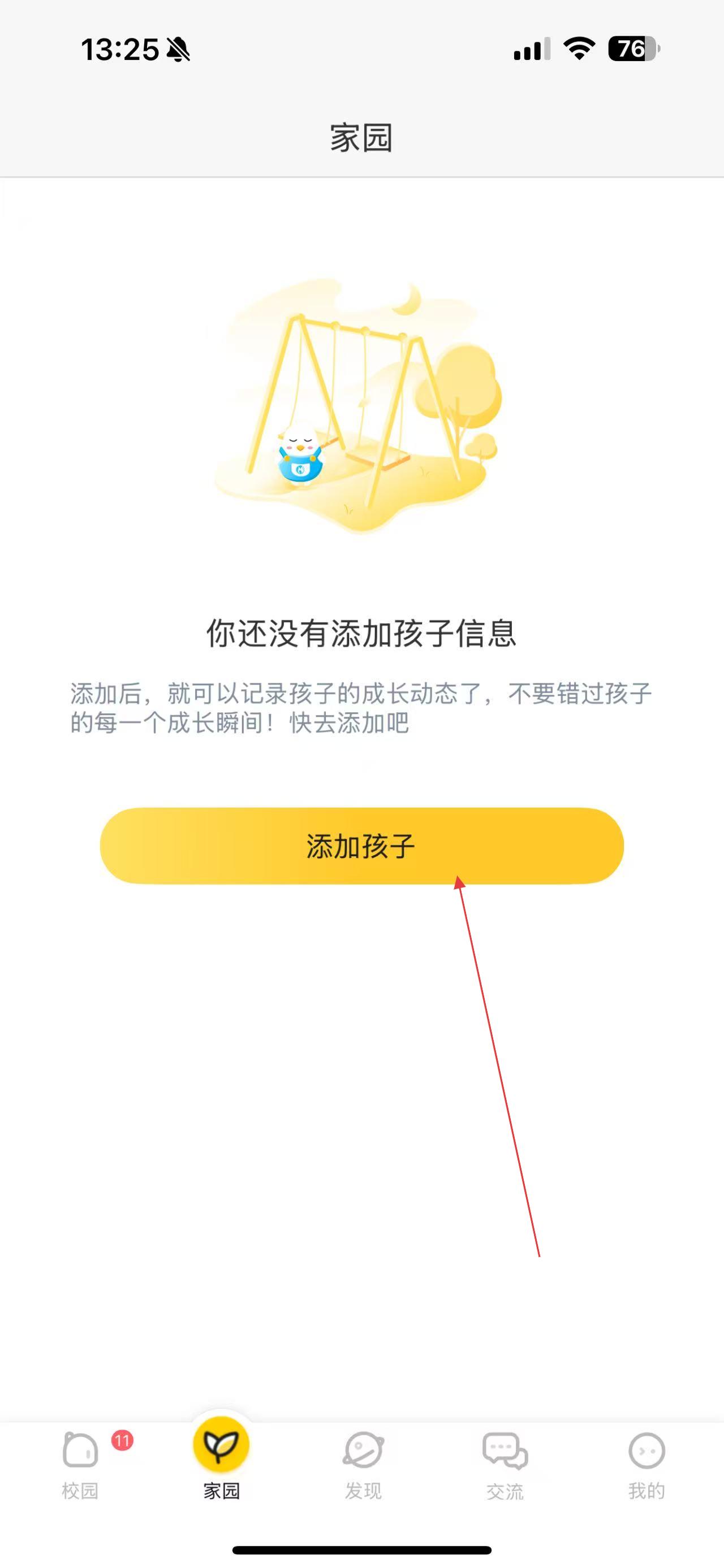 2、在家園頁面中,若未添加孩子信息,點擊添加孩子按鈕。