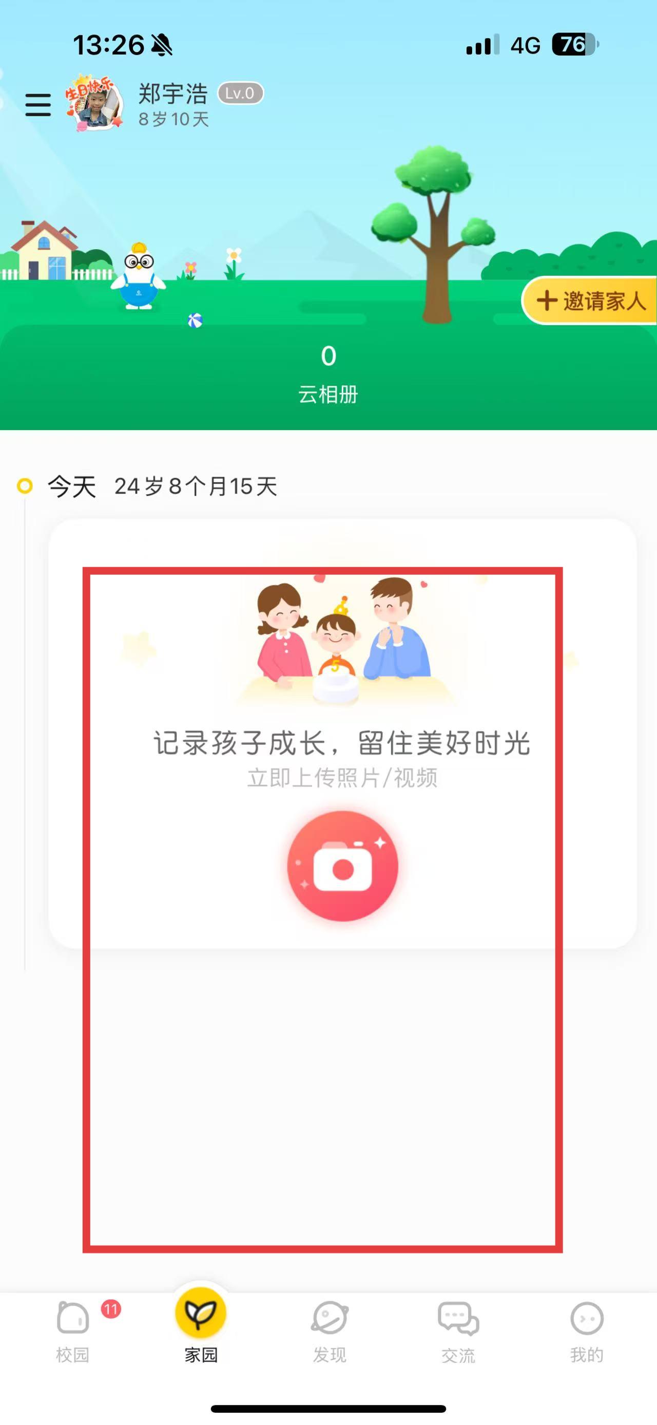 4、添加孩子信息成功后,就可以在家園頁面記錄孩子成長,點擊相關(guān)區(qū)域即可上傳照片或視頻。