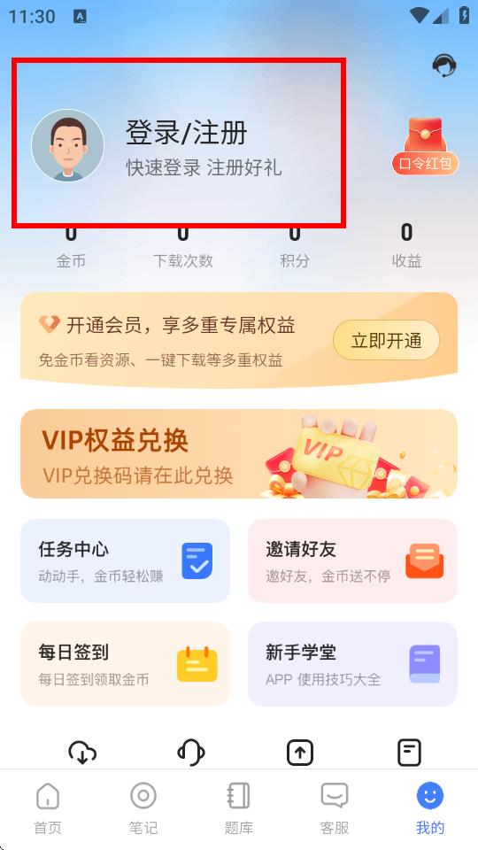 2、在我的頁面中點擊登錄/注冊區(qū)域,進(jìn)入登錄注冊界面。