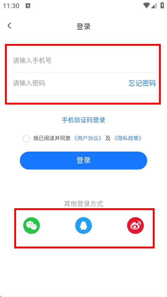 3、在登錄注冊界面有多種注冊登錄方式①可輸入手機號和密碼進(jìn)行注冊登錄,②也能選擇微信、QQ、微博等第三方社交賬號授權(quán)登錄。