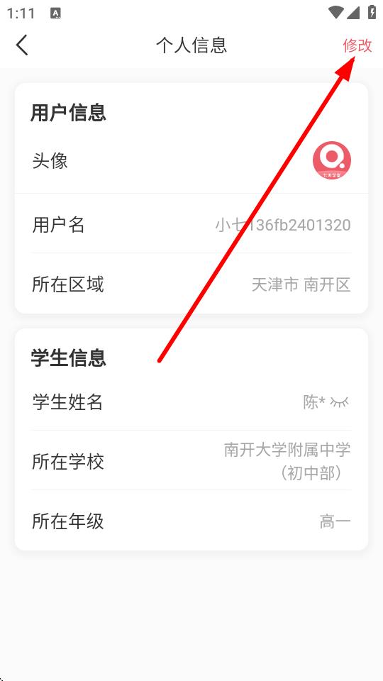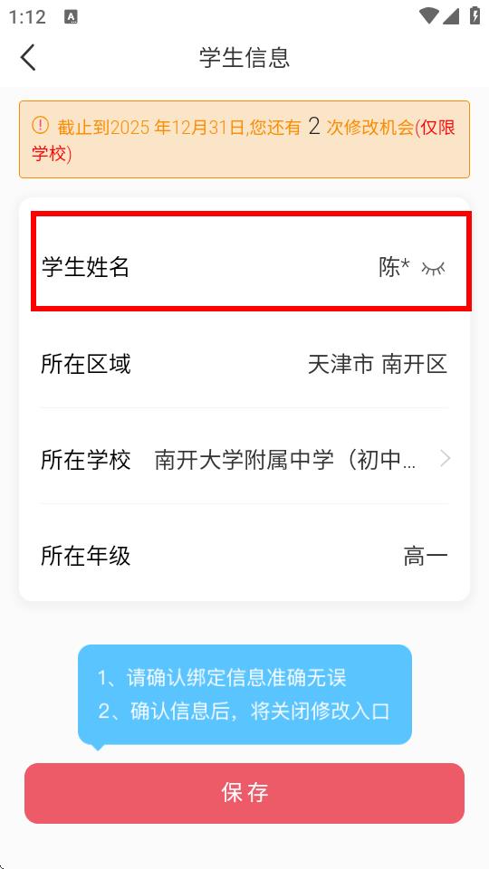 4、進入信息修改頁面后,找到學(xué)生姓名選項,點擊進行修改,修改完成后點擊保存,即可完成學(xué)生名字的修改。