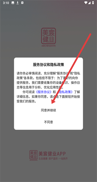 1、點擊“服務協(xié)議和隱私政策”彈窗的“同意并繼續(xù)”,進入美宸健業(yè)APP首頁。