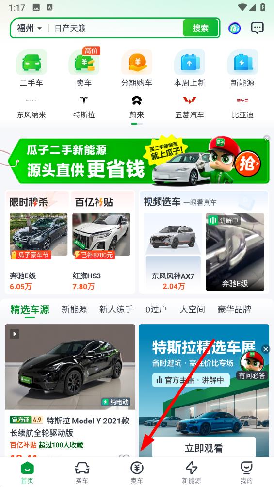 1、打開(kāi)瓜子二手車(chē)app進(jìn)入首頁(yè)后,點(diǎn)擊底部導(dǎo)航欄中的賣(mài)車(chē)選項(xiàng),進(jìn)入賣(mài)車(chē)相關(guān)界面。