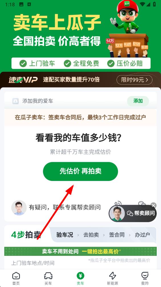 2、在賣(mài)車(chē)界面中,點(diǎn)擊先估價(jià)再拍賣(mài)按鈕,對(duì)您要出售的車(chē)輛進(jìn)行估價(jià)。