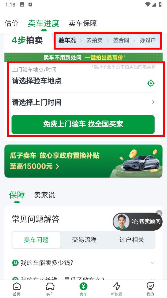 3、估價(jià)完成后,按照頁(yè)面提示,選擇驗(yàn)車(chē)況,填寫(xiě)上門(mén)驗(yàn)車(chē)地點(diǎn)和時(shí)間,預(yù)約免費(fèi)上門(mén)驗(yàn)車(chē)服務(wù),之后依次完成去拍賣(mài)、簽合同、辦過(guò)戶等后續(xù)流程,完成賣(mài)車(chē)操作。