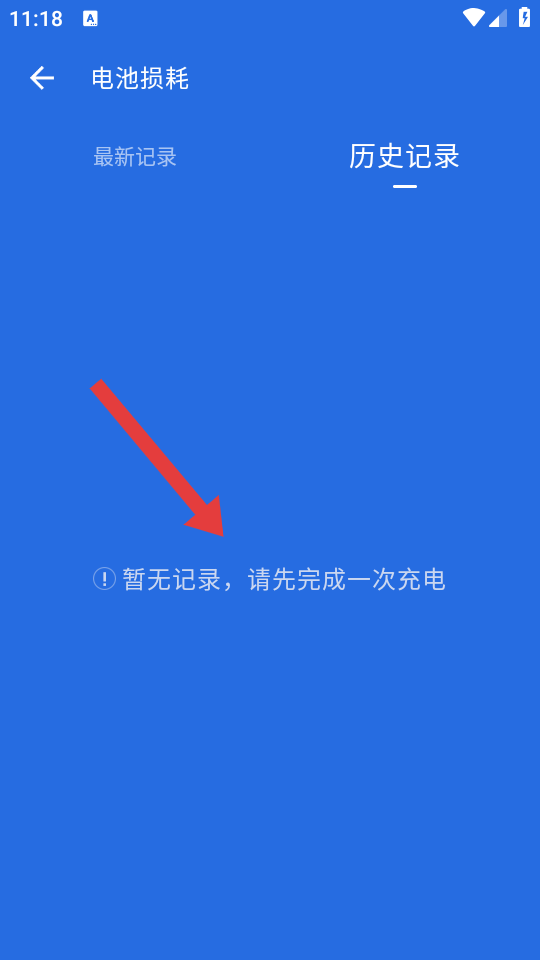4、在歷史記錄的頁(yè)面,若顯示暫無(wú)記錄,需完成一次充電后重新進(jìn)行電池?fù)p耗測(cè)試。