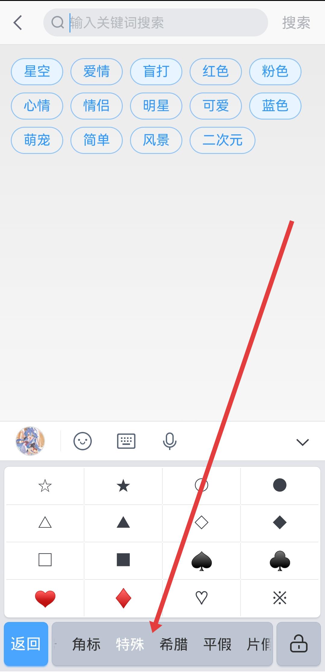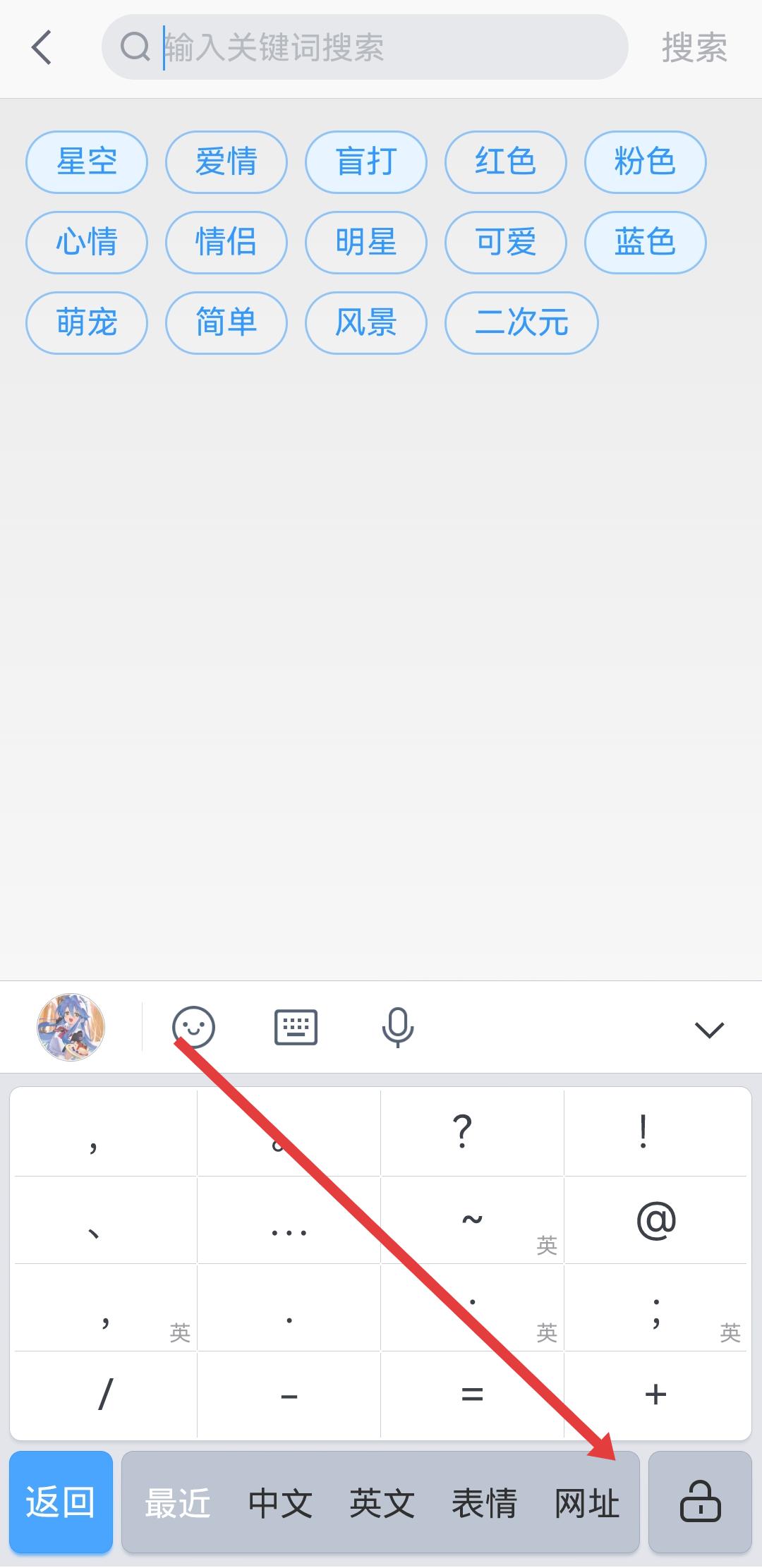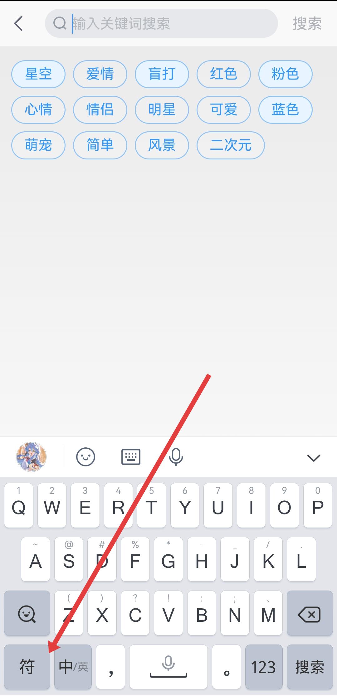 1、在QQ輸入法界面如輸入框喚起后的鍵盤頁,點擊左下角符按鈕,進入符號選擇頁面。