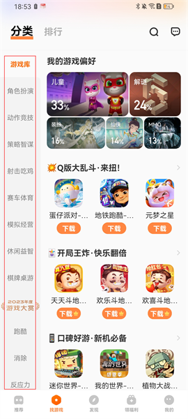 3、點擊下方找游戲,可以看見詳細的游戲分類,沒有目標游戲的玩家可以在這里根據(jù)自己喜歡的游戲類型選擇玩的游戲,系統(tǒng)還會根據(jù)大家的游戲偏好去智能推薦大家可能感興趣的游戲;