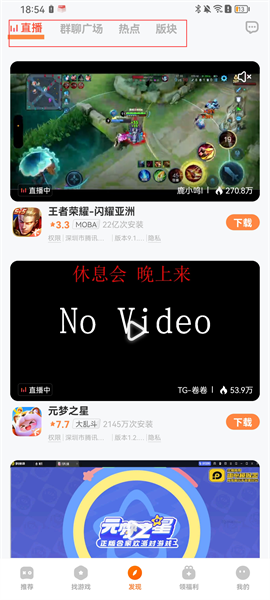 4、點擊發(fā)現(xiàn)欄目,可以看看上分為直播、群聊廣場、熱點、板塊四個欄目,用戶可以在這里觀看自己喜歡的游戲直播,游戲熱點等,還能在群聊廣場中和廣大網(wǎng)友進行交流討論,一起進入房間暢聊;