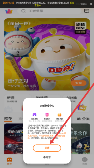 1、打開vivo游戲中心,彈出用戶協(xié)議及隱私政策提示彈窗,點擊橙色同意按鈕,進入應(yīng)用開始瀏覽游戲。