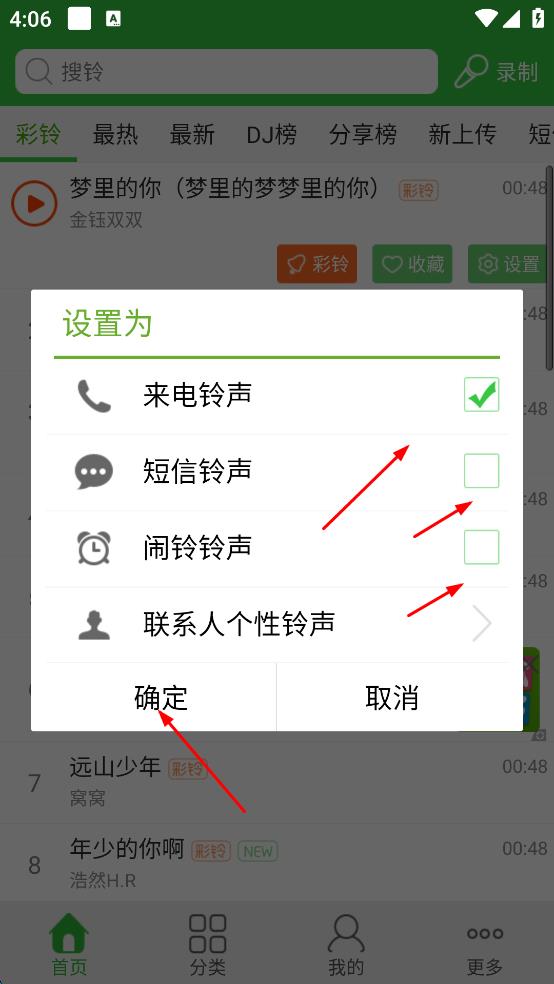 3、在設(shè)置為彈窗,選擇來電鈴聲、短信鈴聲等所需鈴聲類型,點擊確定,完成鈴聲設(shè)置操作 。