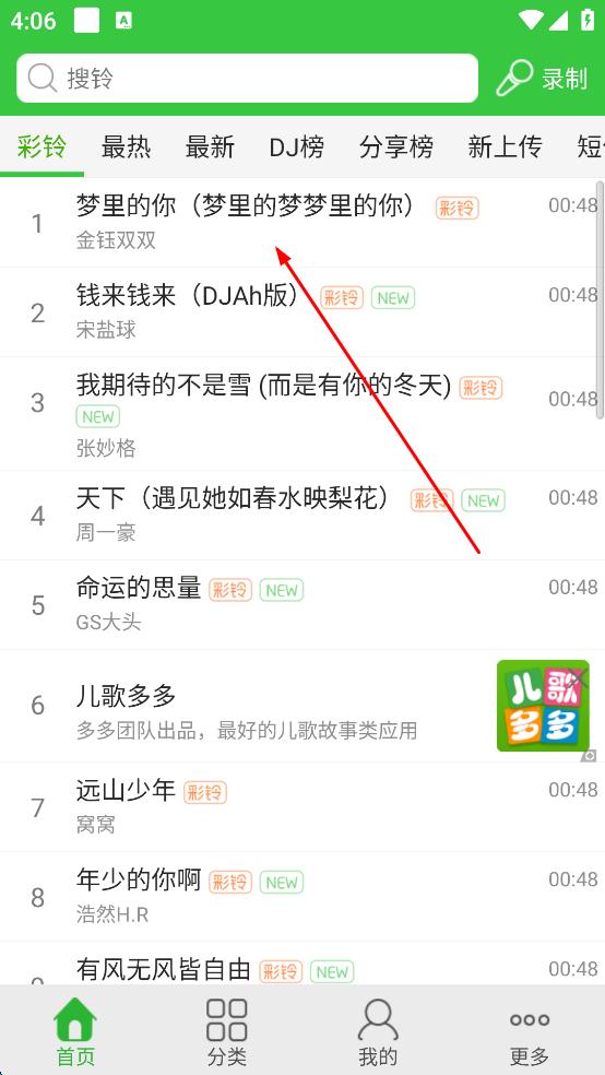 2、在首頁彩鈴列表,找到想設(shè)置的鈴聲如夢里的你,點擊該鈴聲條目,進入鈴聲操作界面。