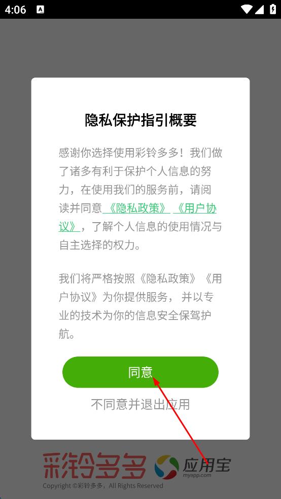 1、打開彩鈴多多APP,彈出隱私保護指引概要,點擊同意,確認接受隱私政策與用戶協(xié)議進入首頁。