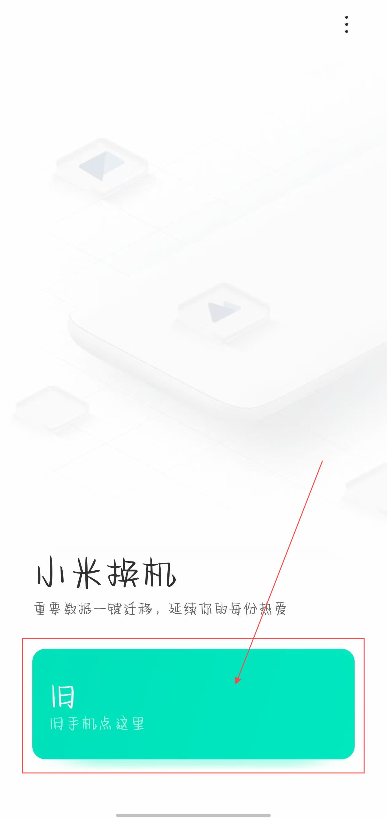 1、打開(kāi)小米換機(jī)應(yīng)用,在主界面,若你是舊手機(jī)操作 ,點(diǎn)擊舊手機(jī)點(diǎn)這里按鈕,進(jìn)入數(shù)據(jù)遷移選擇頁(yè)面 。