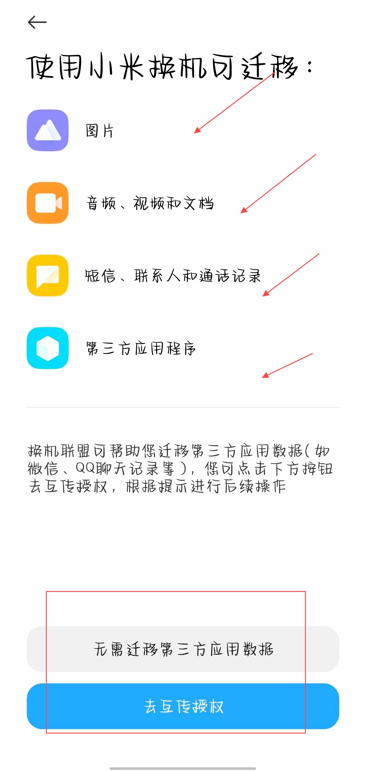 3、若無(wú)需遷移第三方應(yīng)用數(shù)據(jù),可直接按提示進(jìn)行后續(xù)操作;若需要遷移第三方應(yīng)用數(shù)據(jù) ,點(diǎn)擊去互傳授權(quán),根據(jù)提示完成授權(quán)等相關(guān)操作,等待數(shù)據(jù)遷移完成即可 。