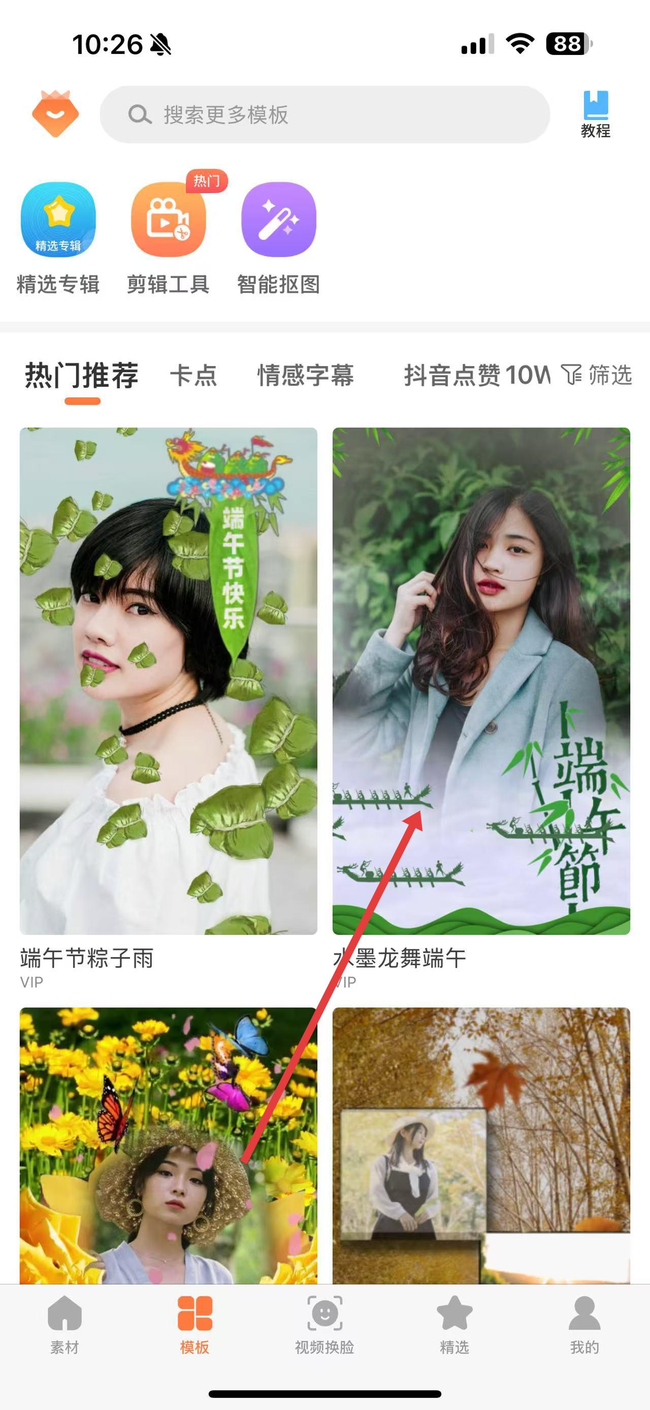 2、在模板選擇界面,瀏覽熱門推薦等分類,挑選自己喜歡的視頻模板,比如水墨龍舞端午。