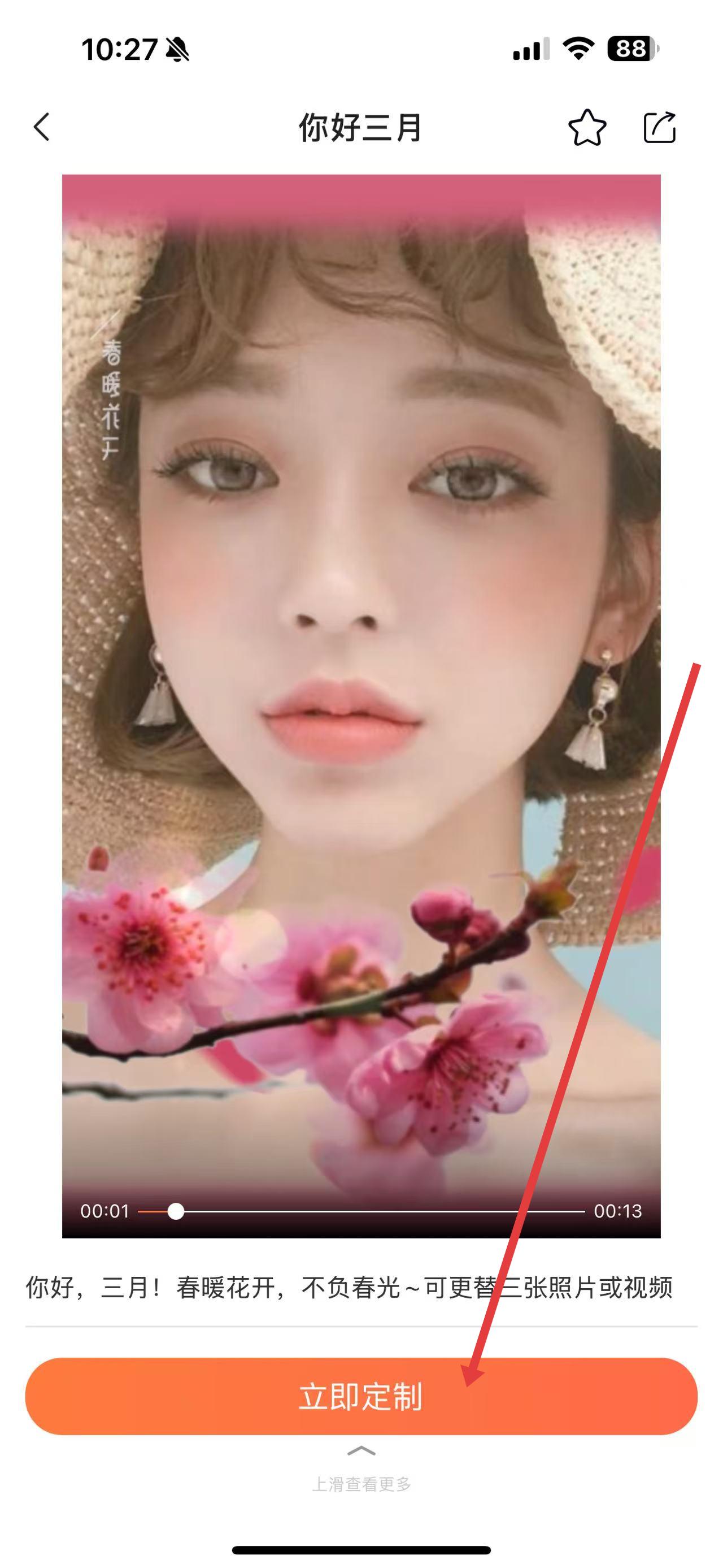 3、點擊選中的模板進入詳情頁,然后點擊立即定制按鈕,按照提示上傳照片或視頻素材,即可生成制作屬于自己的視頻。