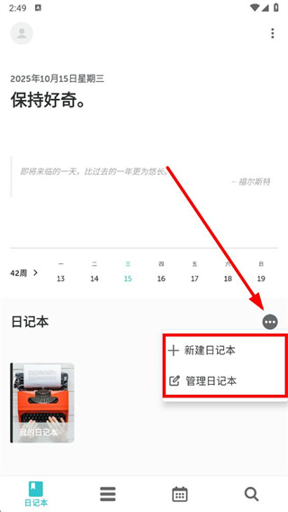 1、打開格志日記app,點(diǎn)擊日記本區(qū)域的三個(gè)點(diǎn)圖標(biāo),可選擇新建日記本或管理日記本。