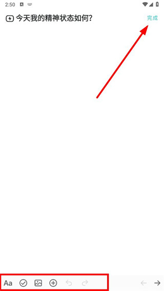 4、在問題記錄頁(yè)面,輸入內(nèi)容后點(diǎn)擊完成按鈕,可利用底部功能圖標(biāo)輔助編輯,完成日記記錄。