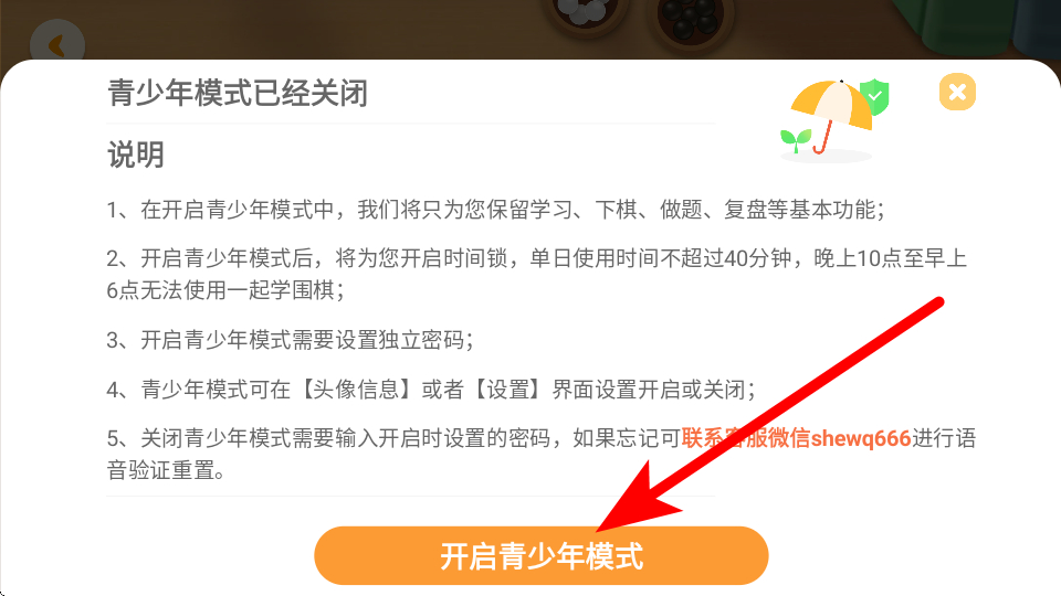 3、在模式說明頁面,點擊開啟青少年模式,進入密碼設(shè)置頁面。