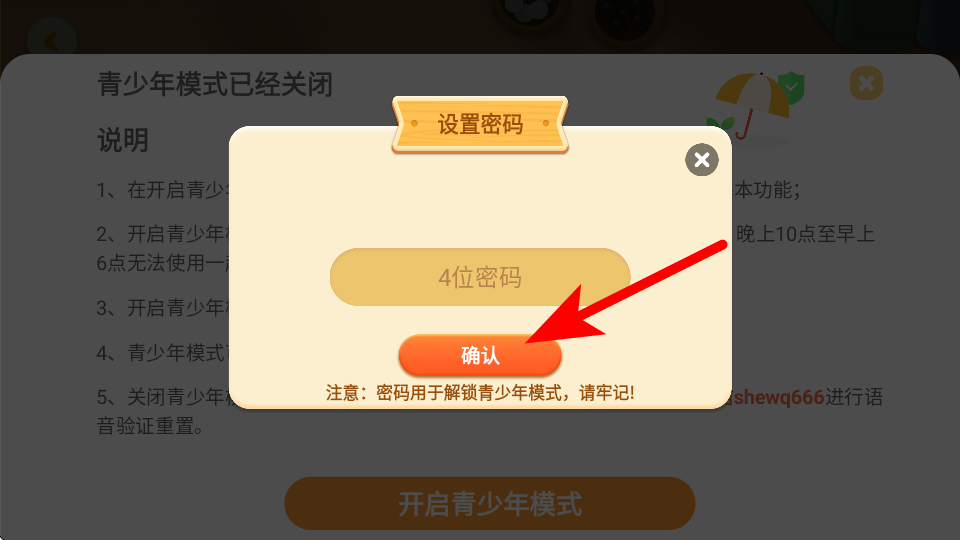 4、在設(shè)置頁面,輸入4位密碼后點擊確認,完成青少年模式開啟操作。
