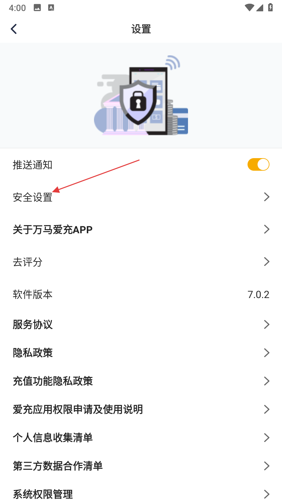 3、在設(shè)置界面里,點(diǎn)擊安全設(shè)置選項(xiàng),進(jìn)入安全設(shè)置頁面。