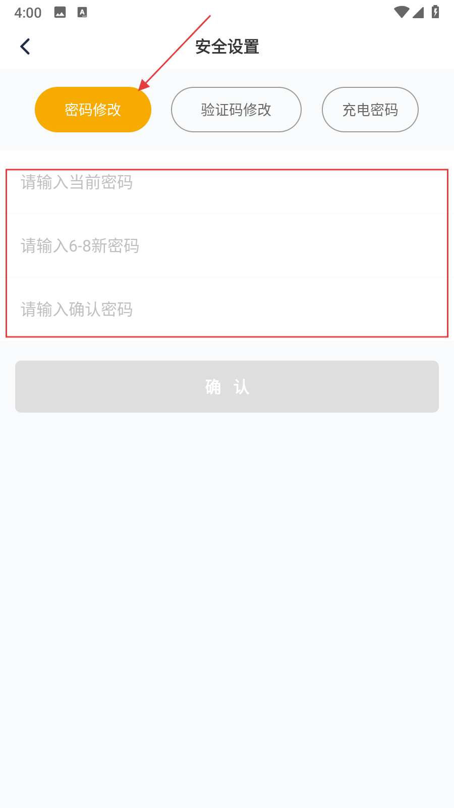 4、在安全設(shè)置頁面,選擇密碼修改選項(xiàng),依次輸入當(dāng)前密碼、確認(rèn)密碼,最后點(diǎn)擊確認(rèn)按鈕。