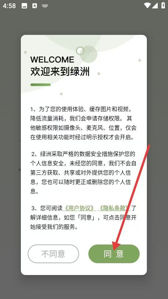 1、打開新浪綠洲app,點(diǎn)擊彈窗中的同意按鈕。