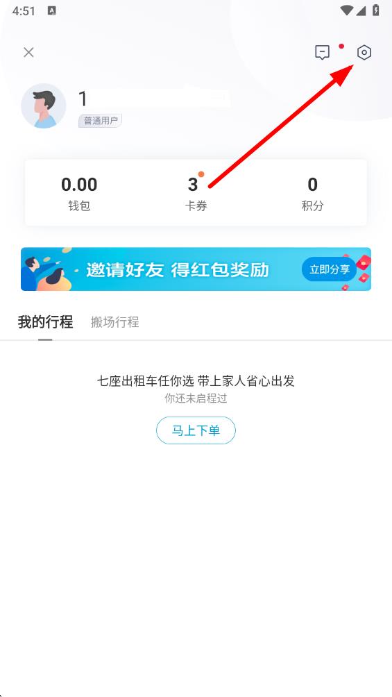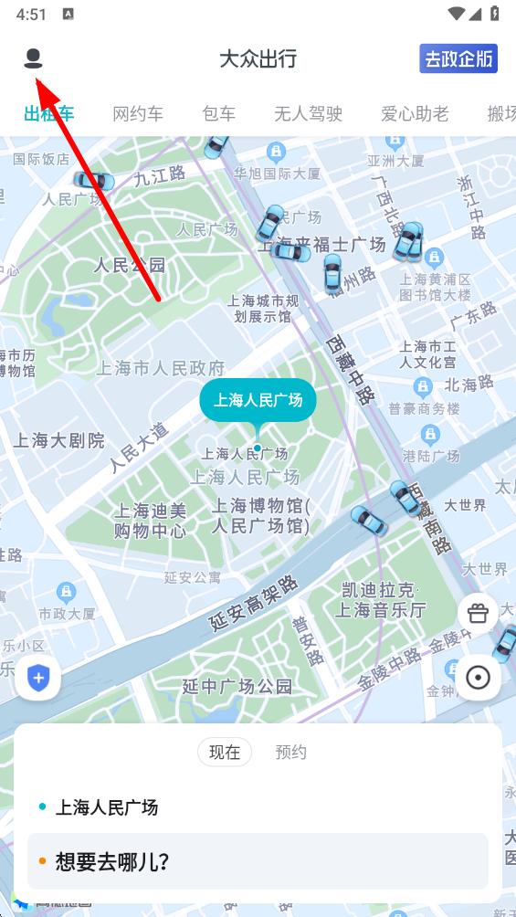 1、打開(kāi)大眾出行app,點(diǎn)擊左上角的個(gè)人頭像圖標(biāo),進(jìn)入個(gè)人頁(yè)面。