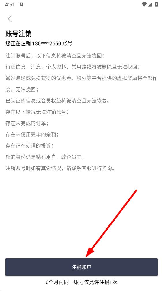 4、在賬號(hào)注銷(xiāo)頁(yè)面,仔細(xì)閱讀注銷(xiāo)賬號(hào)的相關(guān)提示,確認(rèn)無(wú)誤后,點(diǎn)擊注銷(xiāo)賬戶(hù)按鈕,即可注銷(xiāo)賬號(hào)。