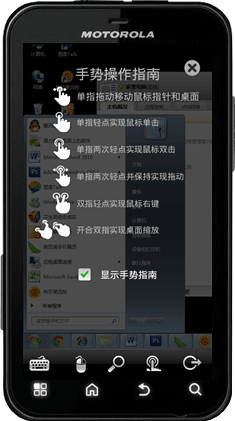 成功登錄遠程主機,將顯示手勢操作指南。向日葵Android版手機在手勢操作支持單指拖動移動鼠標指針和桌面;單指輕點實現(xiàn)鼠標單擊;單指兩次輕點實現(xiàn)鼠標雙擊;單指兩次輕點并保持實現(xiàn)拖動;雙指輕點實現(xiàn)鼠標右鍵;開合雙指實現(xiàn)桌面縮放等。