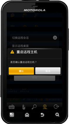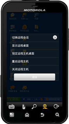 鍵盤、鼠標、縮放功能、退出都比較簡單,分別可調(diào)出電腦鍵盤,調(diào)動電腦鼠標方便控制;可以根據(jù)自己的需求縮放屏幕;退出Android主控端。要說的就是功能鍵,點擊“功能鍵”可進行切換遠程會話、顯示遠程桌面、鎖定遠程主機桌面、重啟遠程主機、關(guān)閉遠程主機操作。