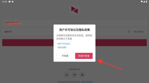 4、點擊后,會彈出用戶許可協(xié)議及隱私政策,點擊同意并登錄的按鈕即可。