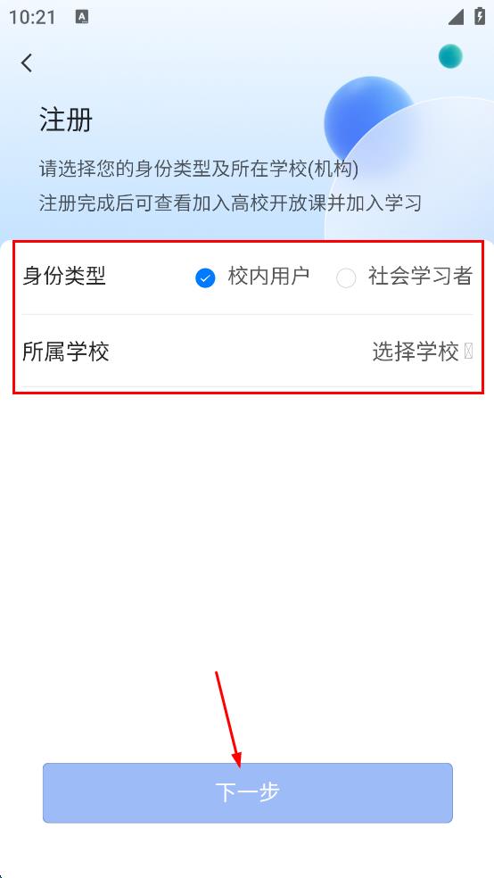 4、在注冊頁面,選擇身份類型,若為校內(nèi)用戶則勾選,然后選擇所屬學校,完成后點擊“下一步”,按照后續(xù)提示完成注冊流程。