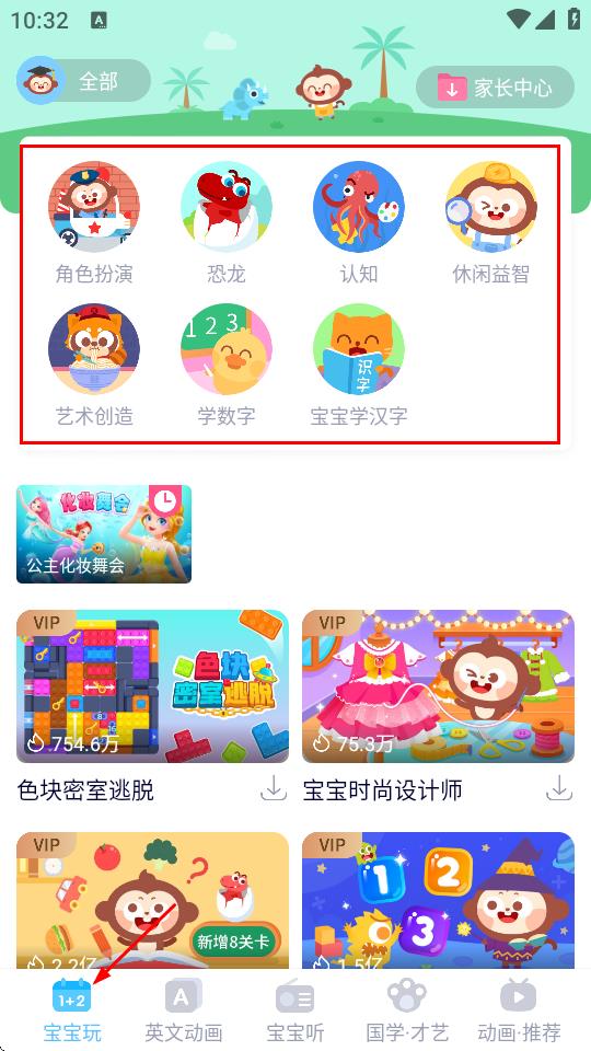 1、點擊底部導(dǎo)航欄的寶寶玩,提供角色扮演、恐龍、認(rèn)知、休閑益智、藝術(shù)創(chuàng)造、學(xué)數(shù)字、寶寶學(xué)漢字等多樣化早教內(nèi)容,激發(fā)孩子的學(xué)習(xí)興趣。