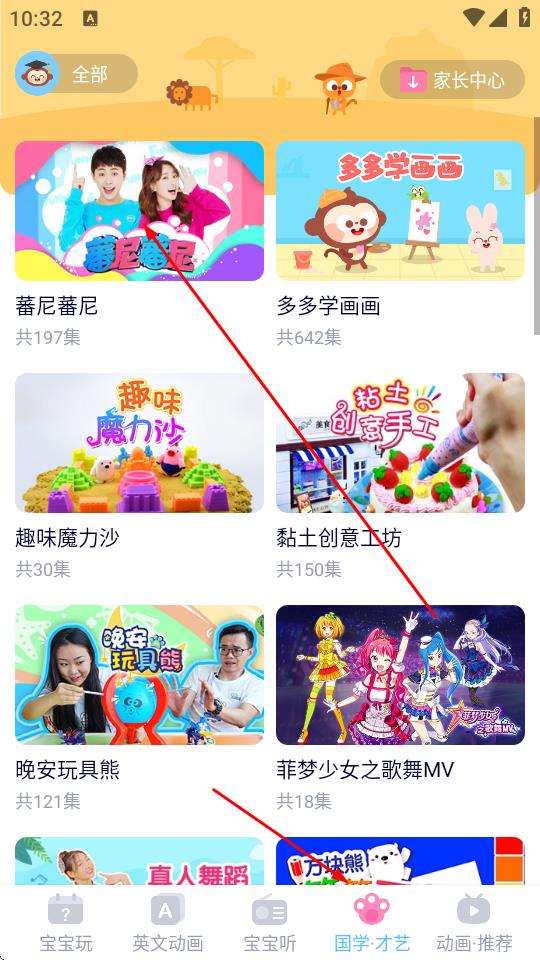 4、包含蕃尼蕃尼、多多學(xué)畫畫、趣味魔力沙、黏土創(chuàng)意工坊、晚安玩具熊、菲夢少女之歌舞MV等內(nèi)容,能讓孩子學(xué)習(xí)國學(xué)知識,還能培養(yǎng)才藝。