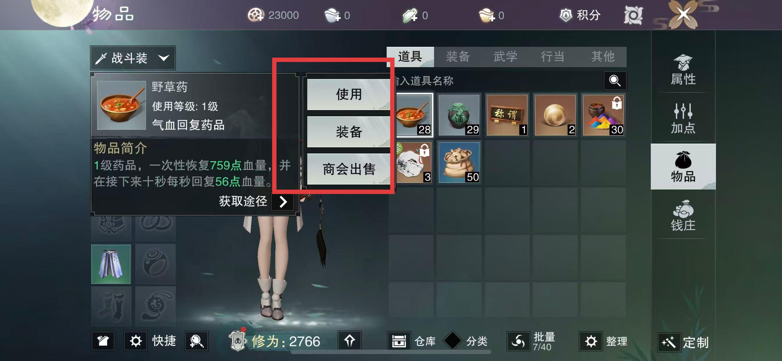 3、選擇使用、裝備、商會出售等操作,根據(jù)需求進行選擇即可。