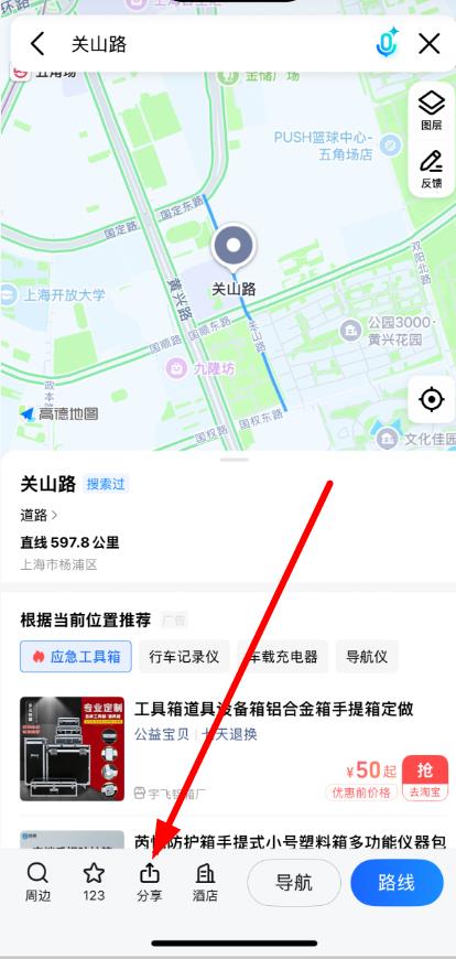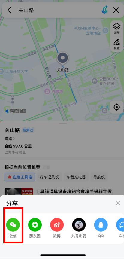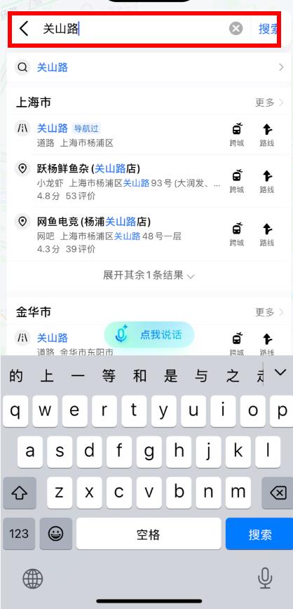 1、打開高德地圖,在搜索欄輸入要分享的路線地點,如關山路然后點擊搜索。