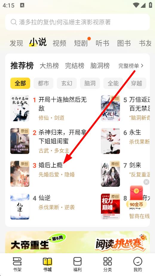 1、打開七貓小說(shuō)APP,進(jìn)入書城界面,在小說(shuō)分類下的各類榜單中,選擇想要下載的小說(shuō),比如婚后上癮,點(diǎn)擊進(jìn)入小說(shuō)詳情頁(yè)。