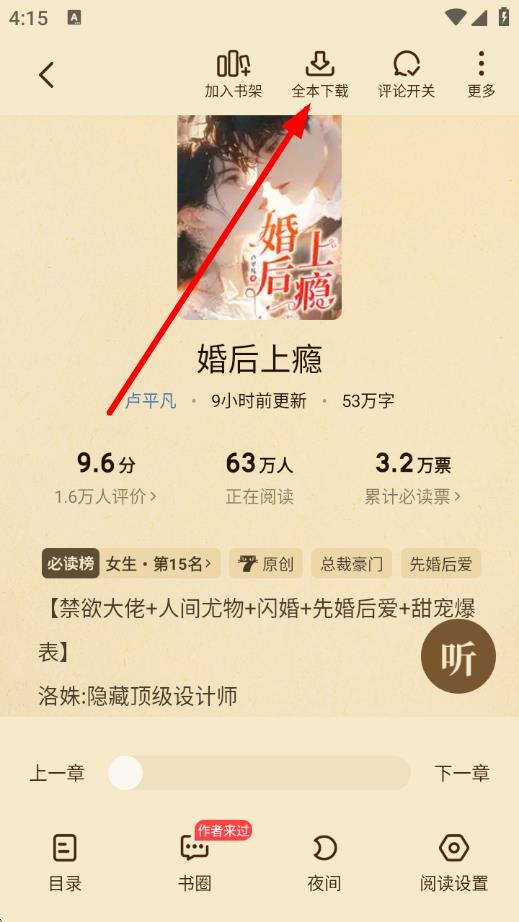 2、在小說(shuō)閱讀界面上方,點(diǎn)擊全本下載按鈕,會(huì)彈出下載方式選擇窗口。