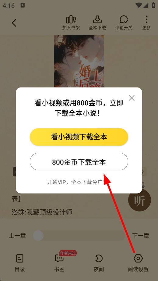3、在彈出的窗口中,可選擇看小視頻下載全本,按提示觀看視頻完成下載;或者選擇800金幣下載全本,消耗相應(yīng)金幣將小說(shuō)下載到本地。