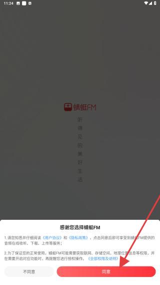 1、打開蜻蜓fm的應(yīng)用軟件,進(jìn)入時(shí)會(huì)彈出用戶協(xié)議與隱私政策,點(diǎn)擊同意的按鈕。