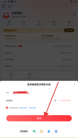 4、在下方彈出的登錄框中,輸入要登錄的手機(jī)號(hào)、驗(yàn)證碼,再點(diǎn)擊登錄的按鈕即可。